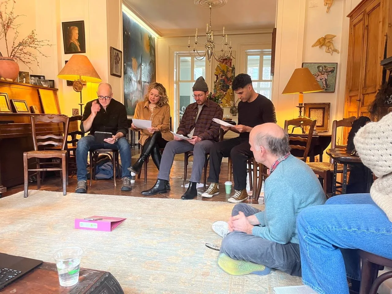 In fall 2023, during the SAG strike, the great actress Kathleen Chalfant, offered YPU her living room. Over two afternoons in November, 2023 and January, 2024, a group of actors came together for YPU’s first in-person reading. Three of the young writers were there. The other writers joined on Zoom from Ukraine, Austria, Canada, Germany and England. The actors joining us in Brooklyn included: Kelly AuCoin, Cara Buono, Kathleen Chalfant, Catherine Curtin, Olli Haaskivi, Trí Lê, Babak Tafti, Samantha Mathis, Colbie Minifi, Jennifer Mudge, Frank Wood